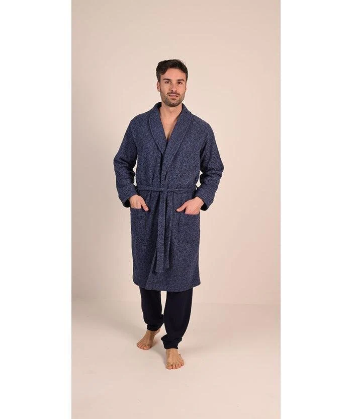 Vestaglia lunga uomo flanellata in Punto Milano con collo a scialle, cintura e tasconi sul davanti in delicata microfantasia .