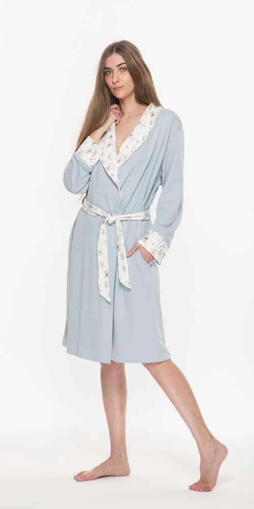 Vestaglia donna in morbido caldo cotone in tinta unita, con collo, polsini e cintura a fantasia maculata.