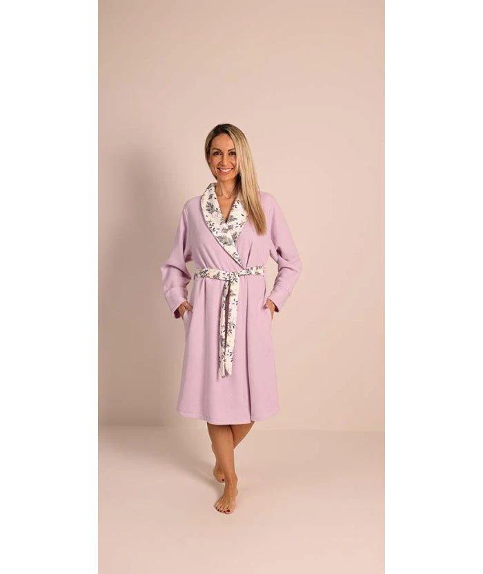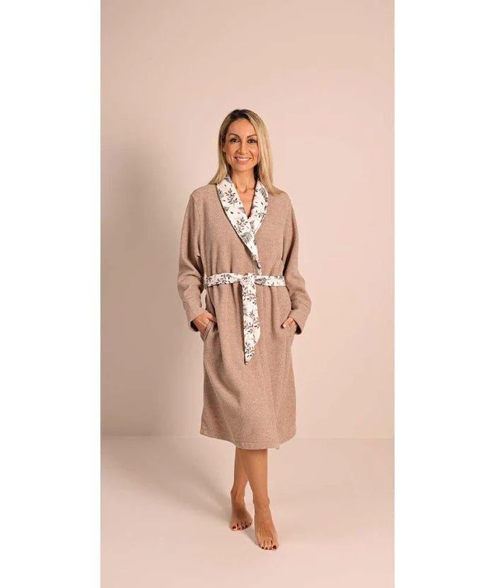 Vestaglia donna flanellata in Punto Milano tinta unita con collo a scialle a fantasia, con tasche e cintura.