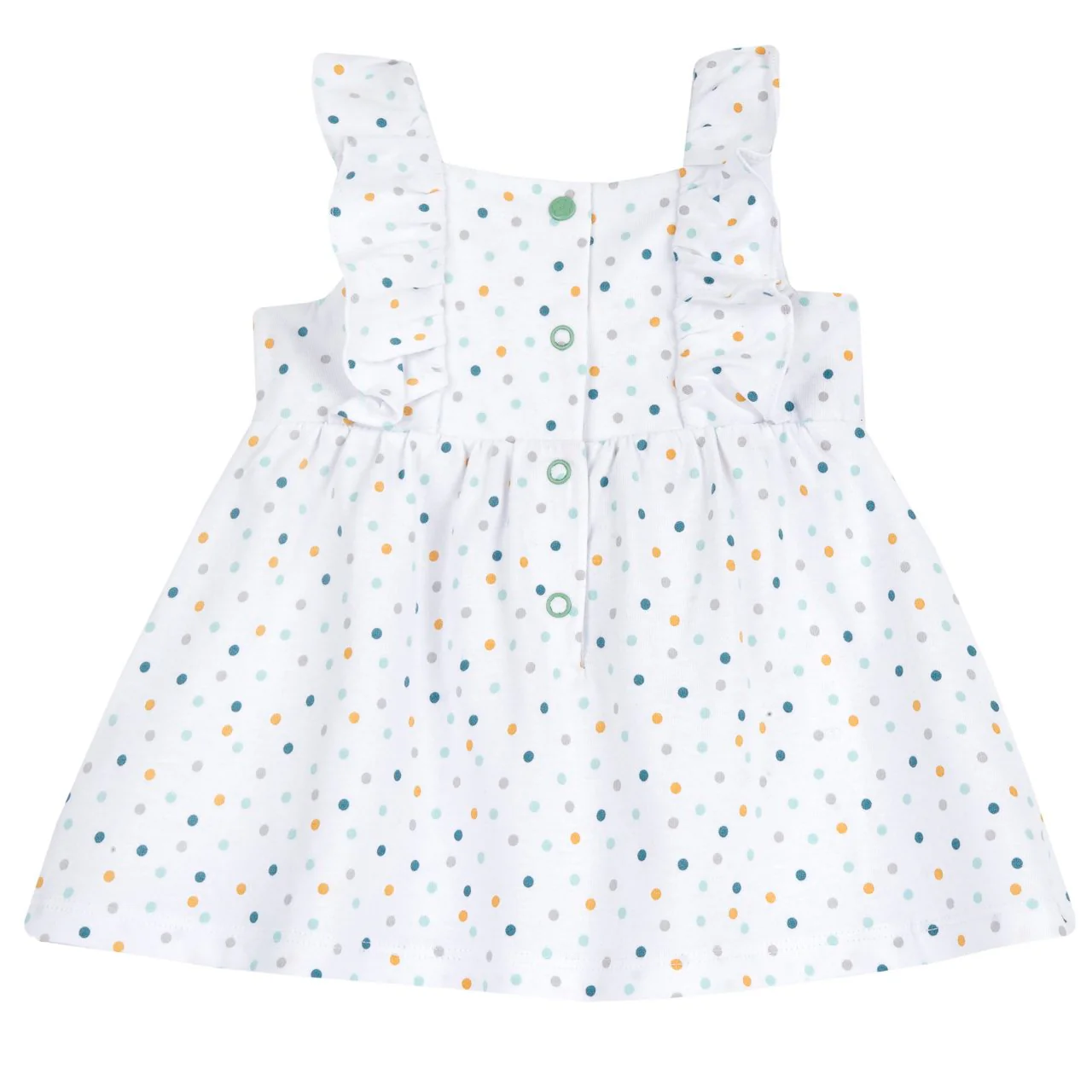Vestito con collo squadrato e maniche ad aletta in jersey stampato Stampa fantasia pois multicolore Aperto dietro con bottoncini automatici Prodotto con Certificazione Oeko-Tex: la qualità per il tuo bambino