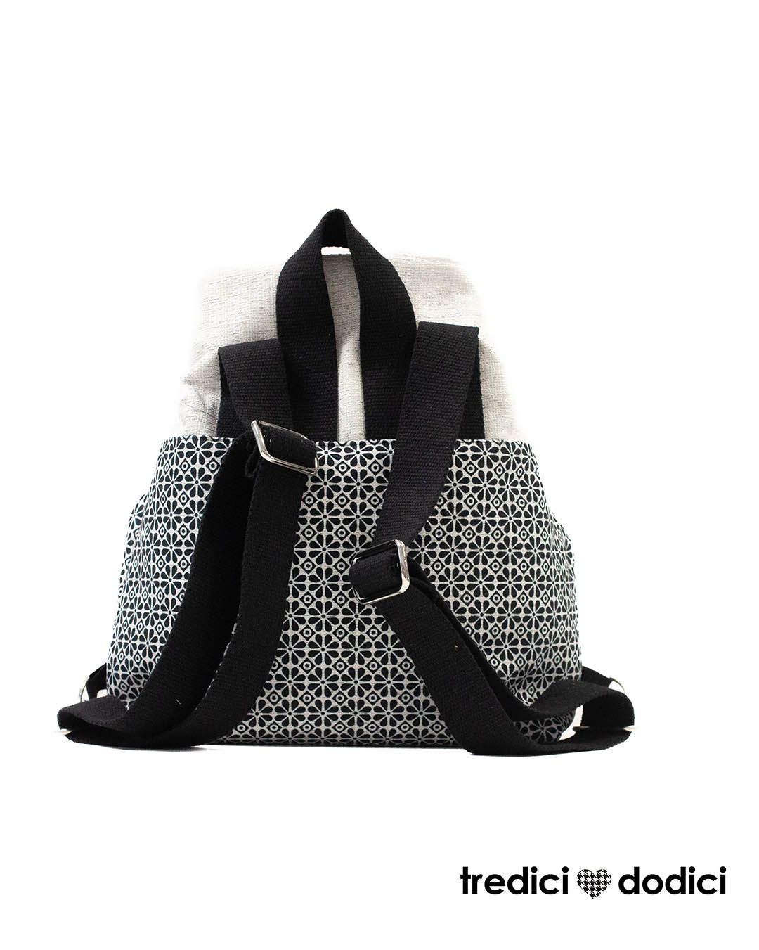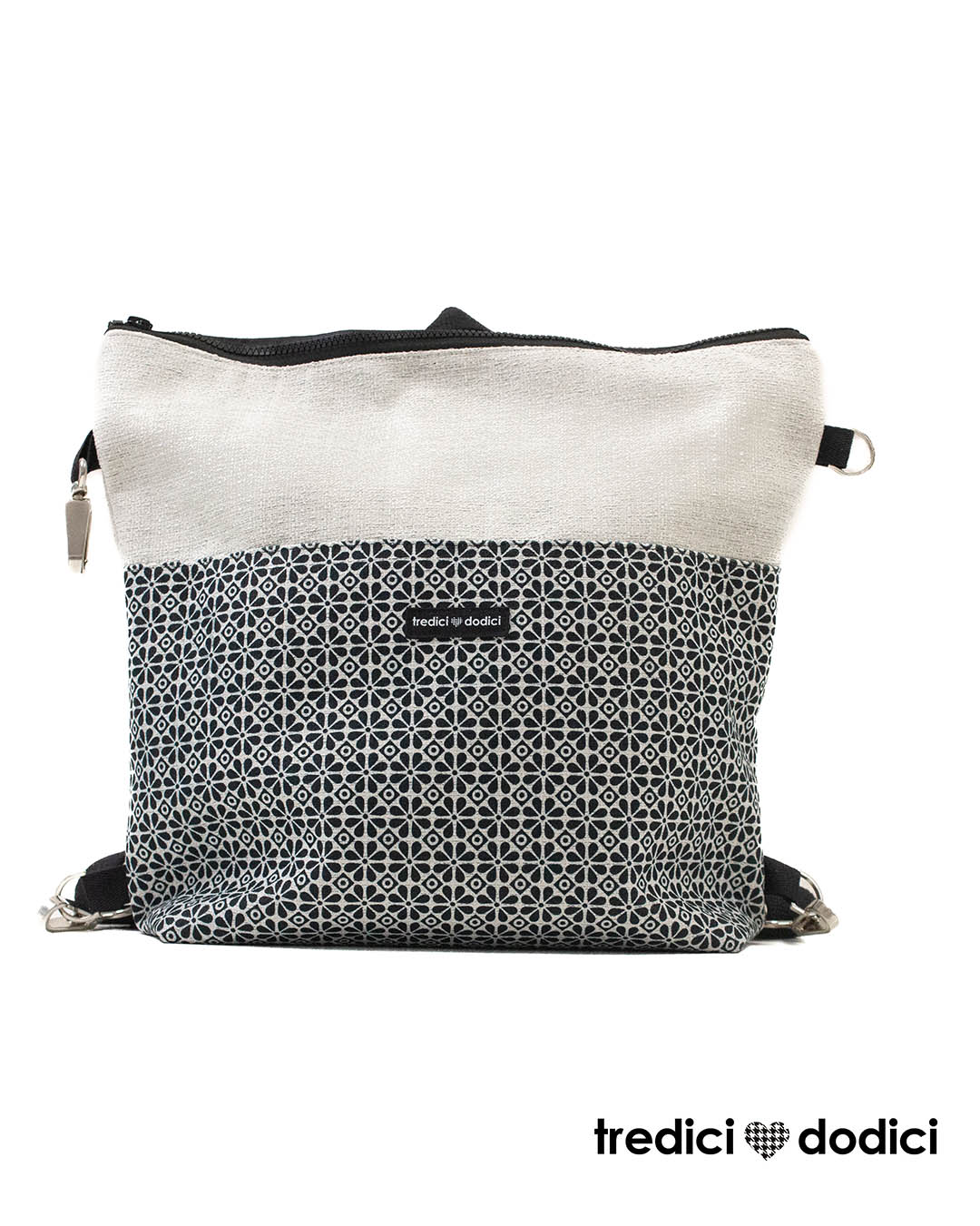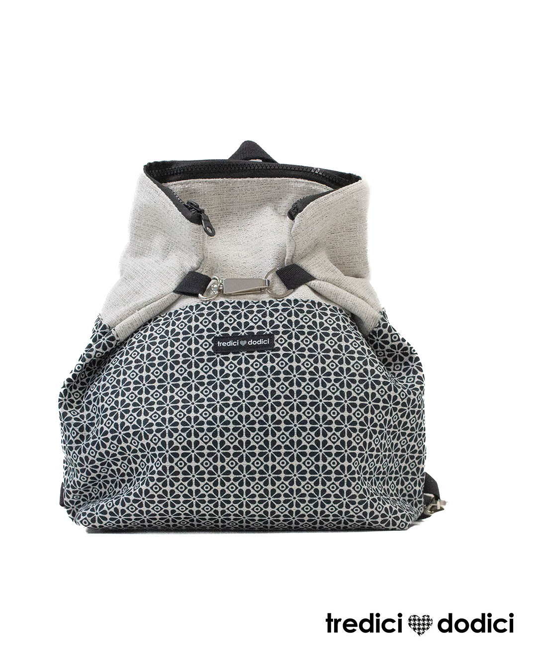 Zaino in tessuto da tappezzeria molto resistente e capiente con cerniera, tasca interna e bretelle regolabili.