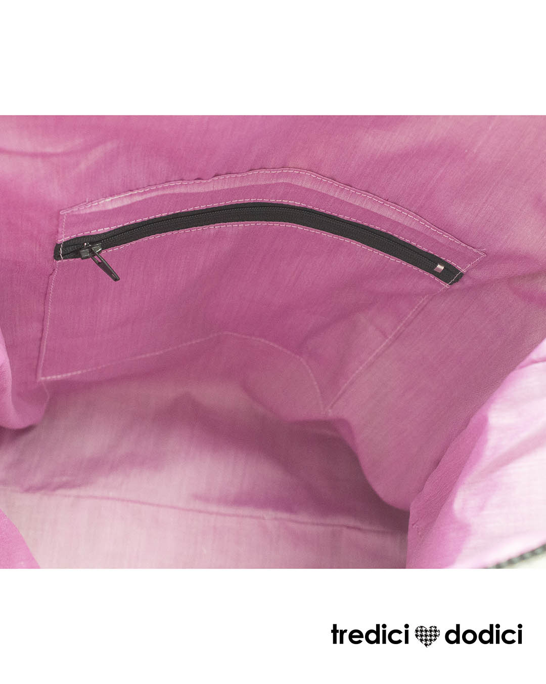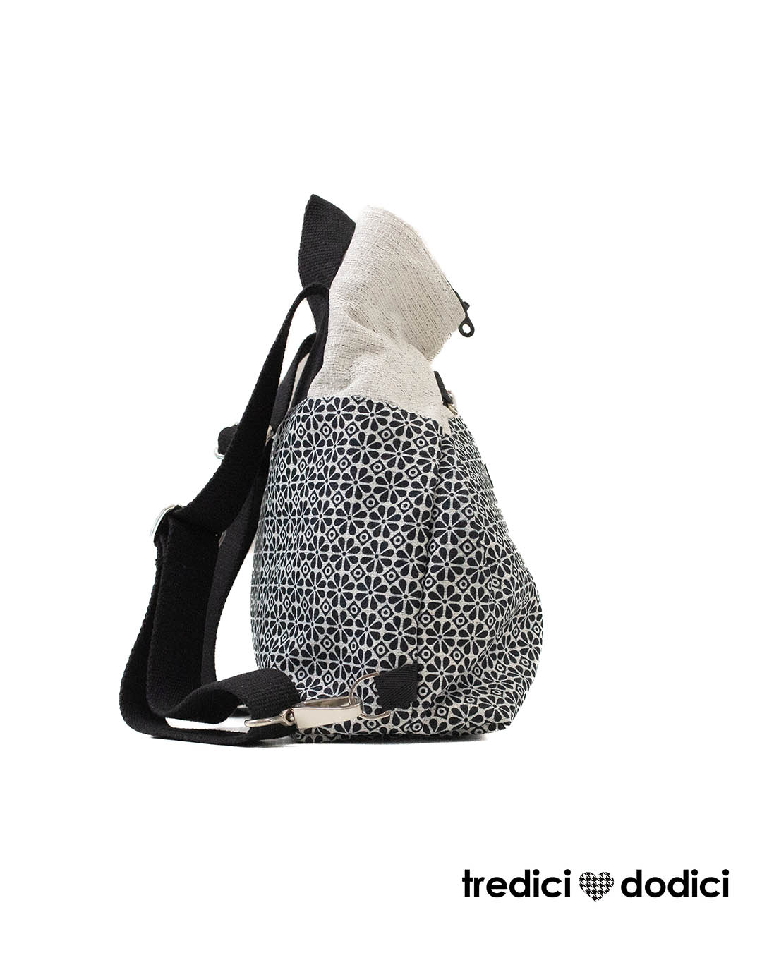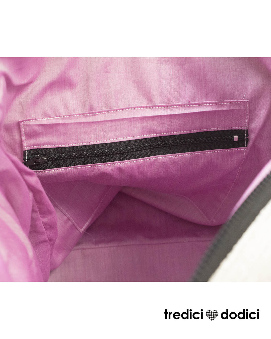 Zaino in tessuto da tappezzeria molto resistente e capiente con cerniera, tasca interna e bretelle regolabili.