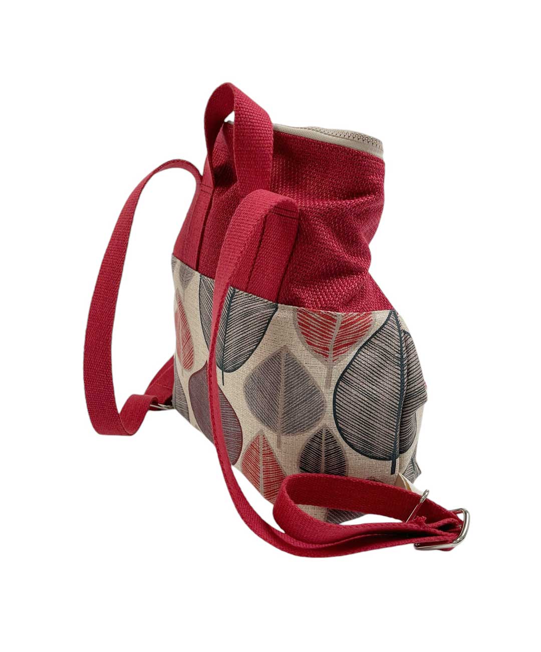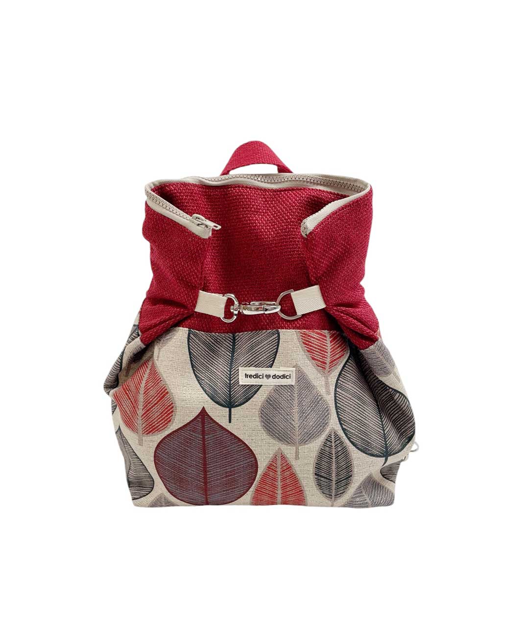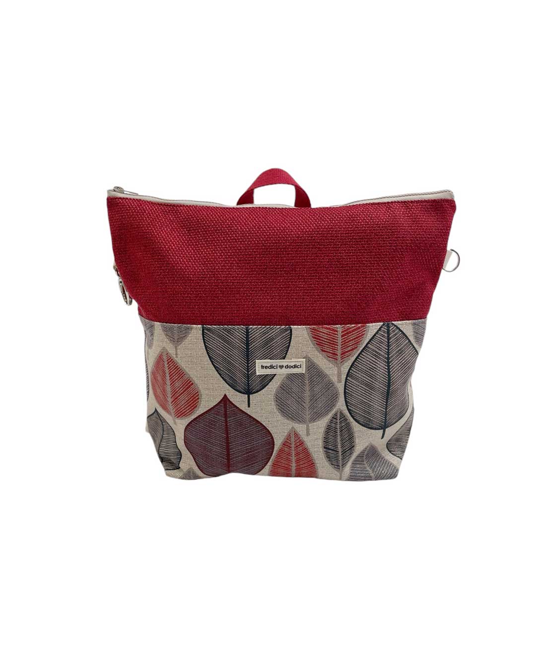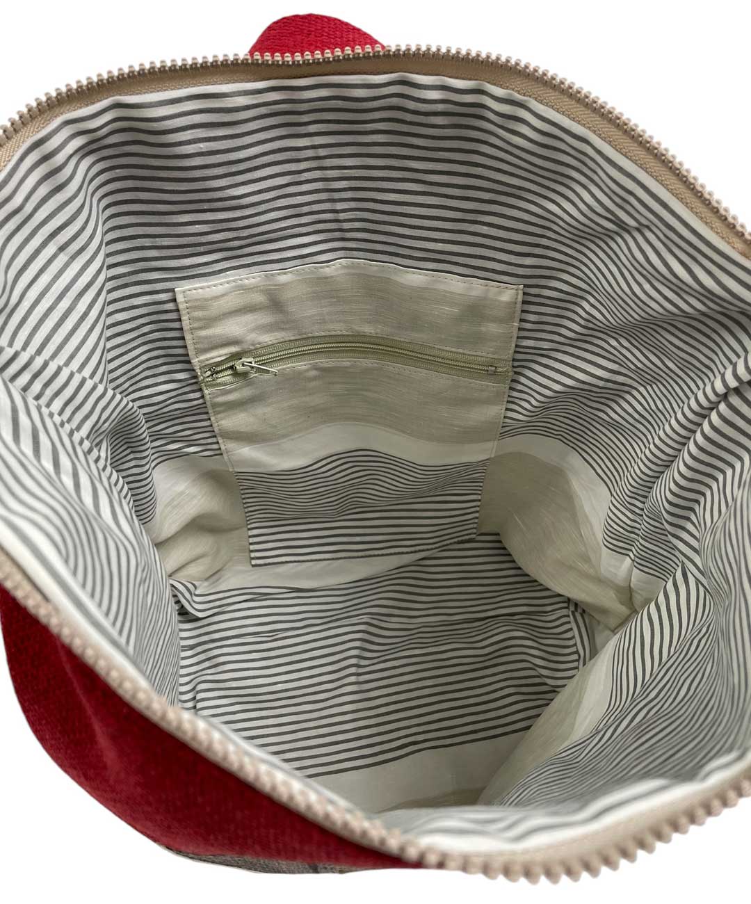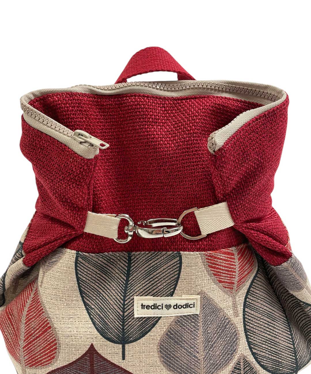 Zaino in tessuto da tappezzeria molto resistente e capiente con cerniera, tasca interna e bretelle regolabili.