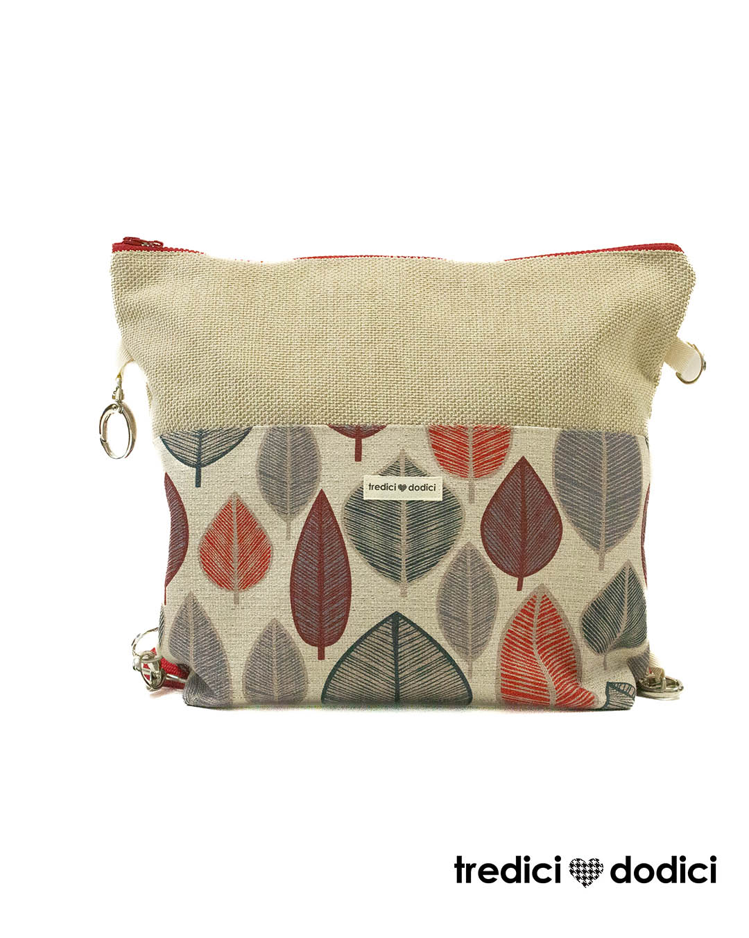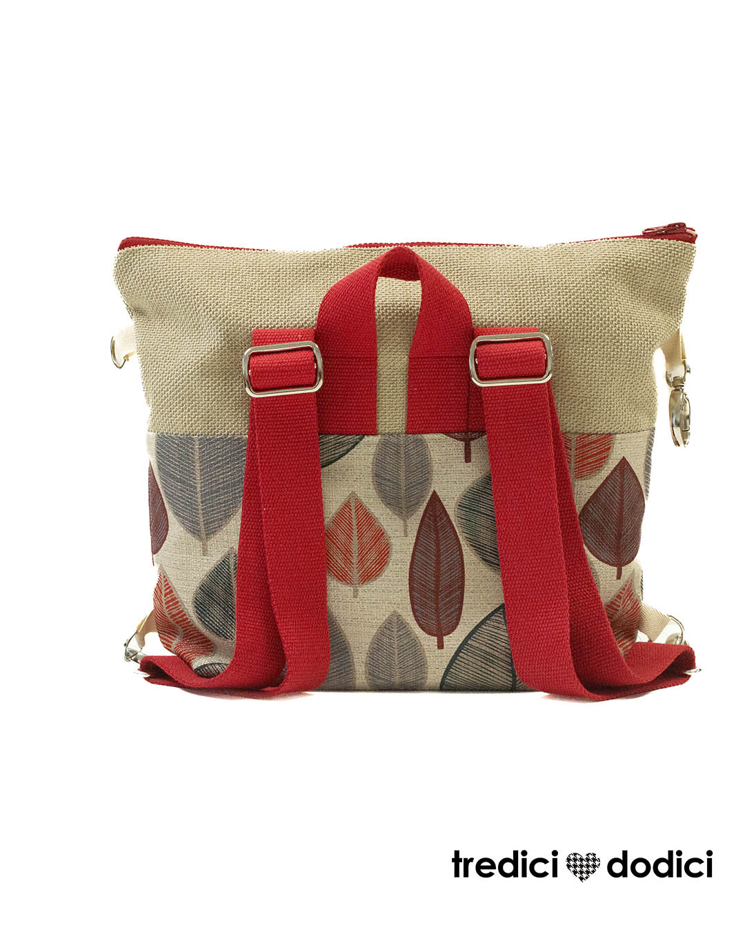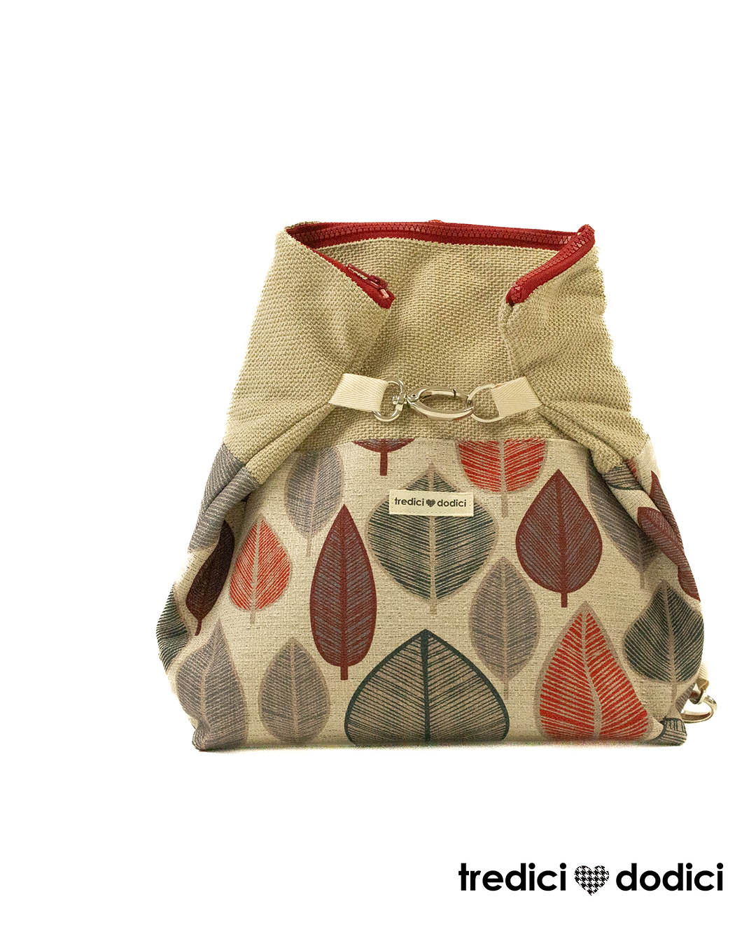 Zaino in tessuto da tappezzeria molto resistente e capiente con cerniera, tasca interna e bretelle regolabili.