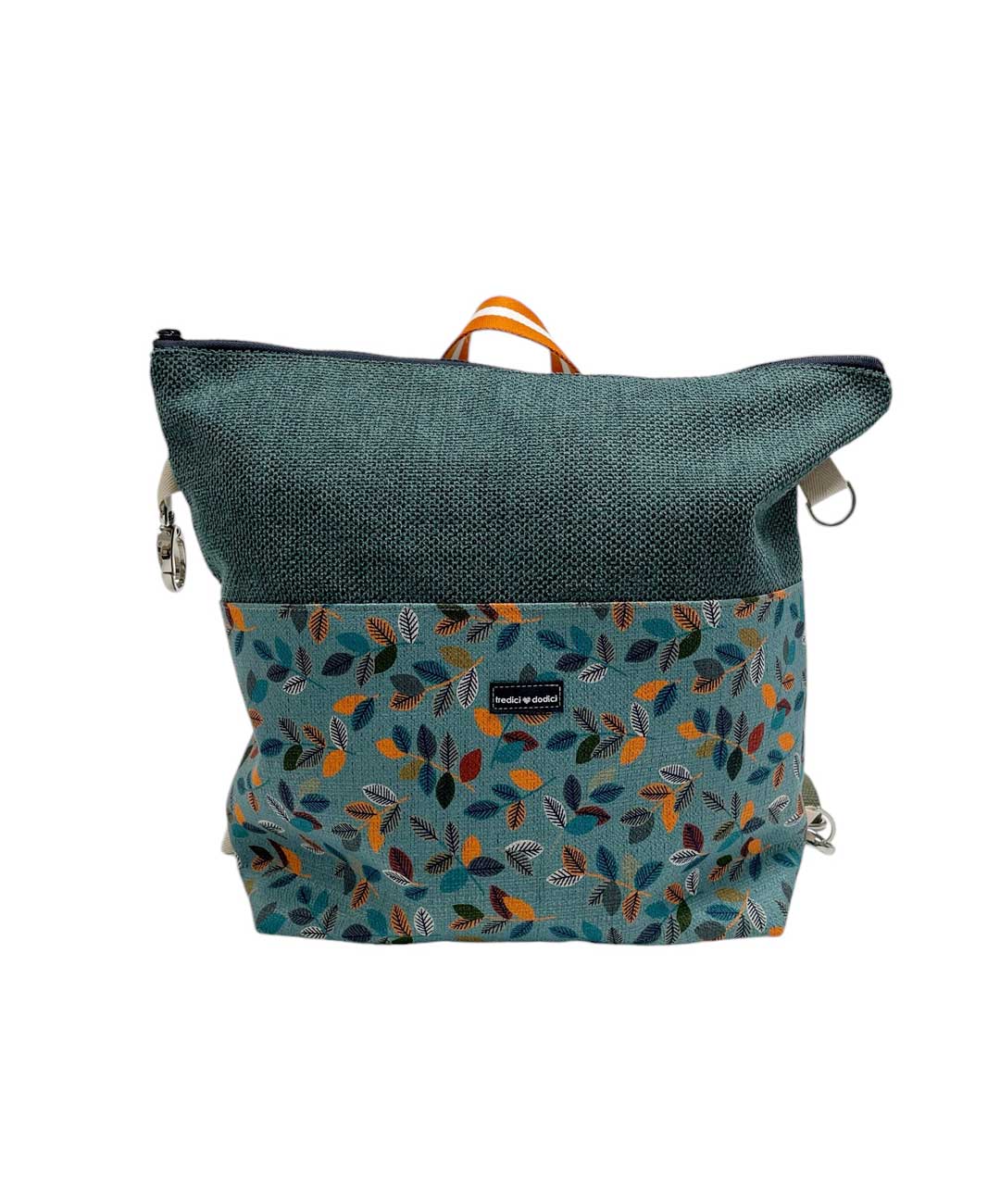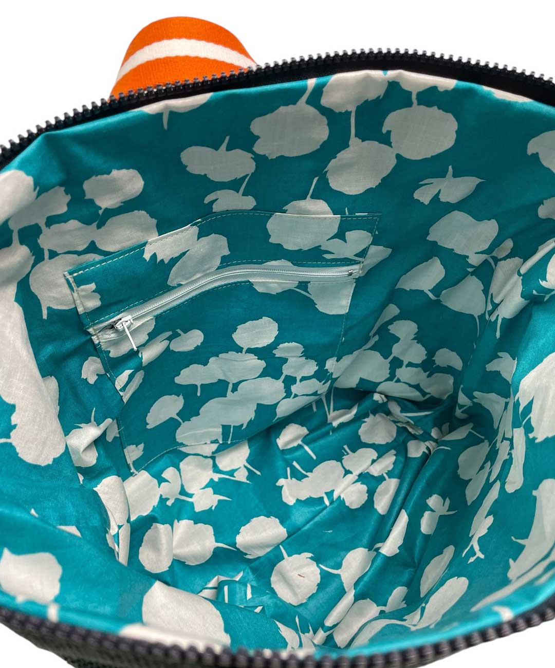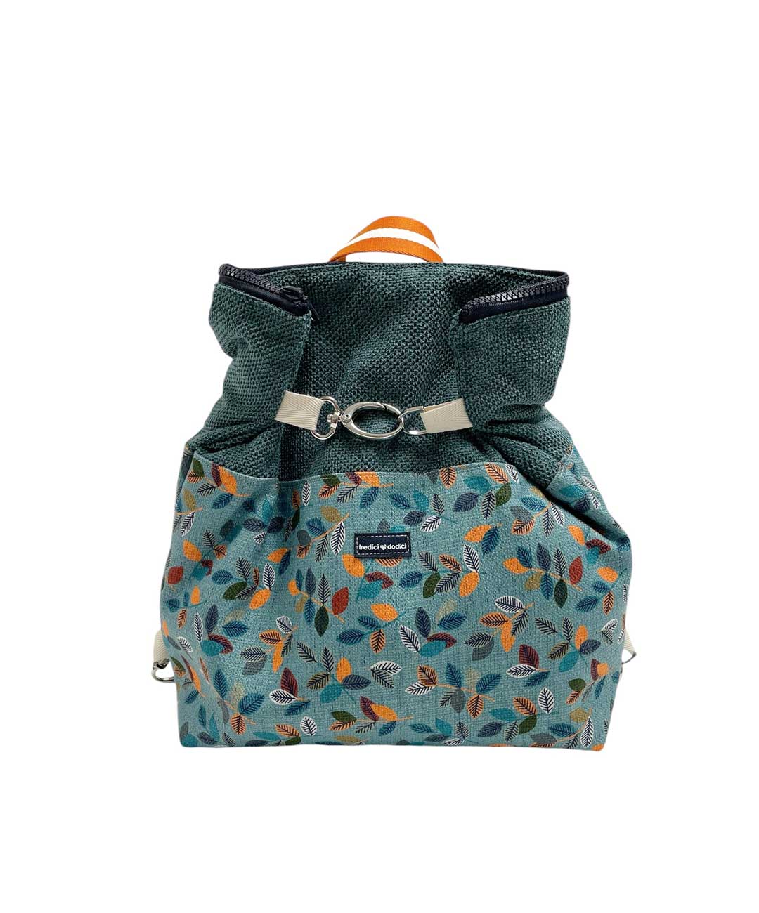 Zaino in tessuto da tappezzeria molto resistente e capiente con cerniera, tasca interna e bretelle regolabili.