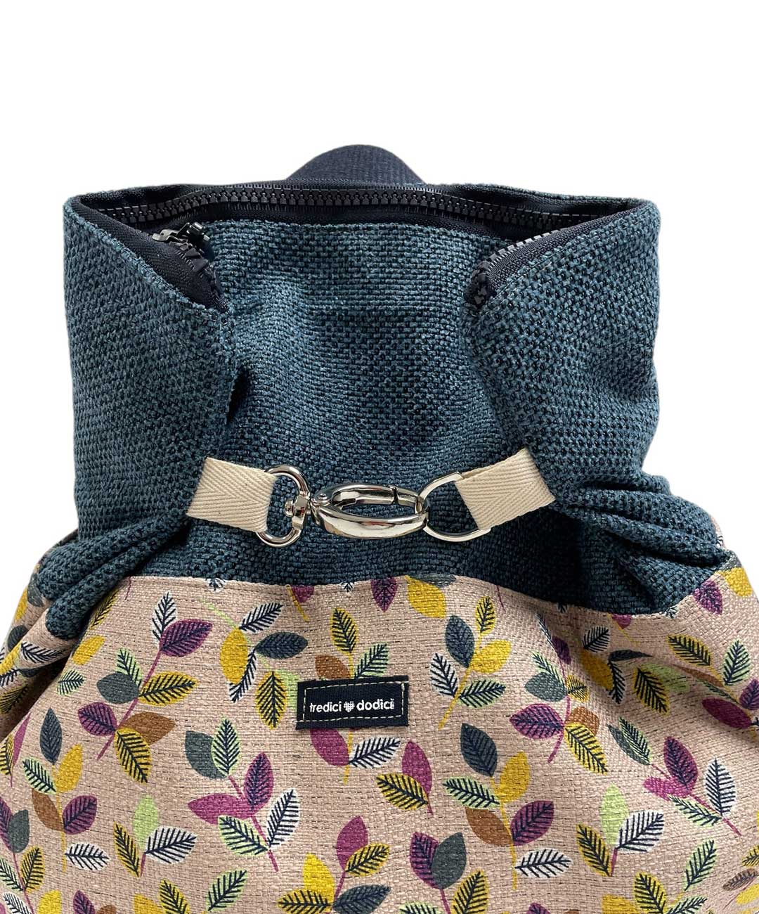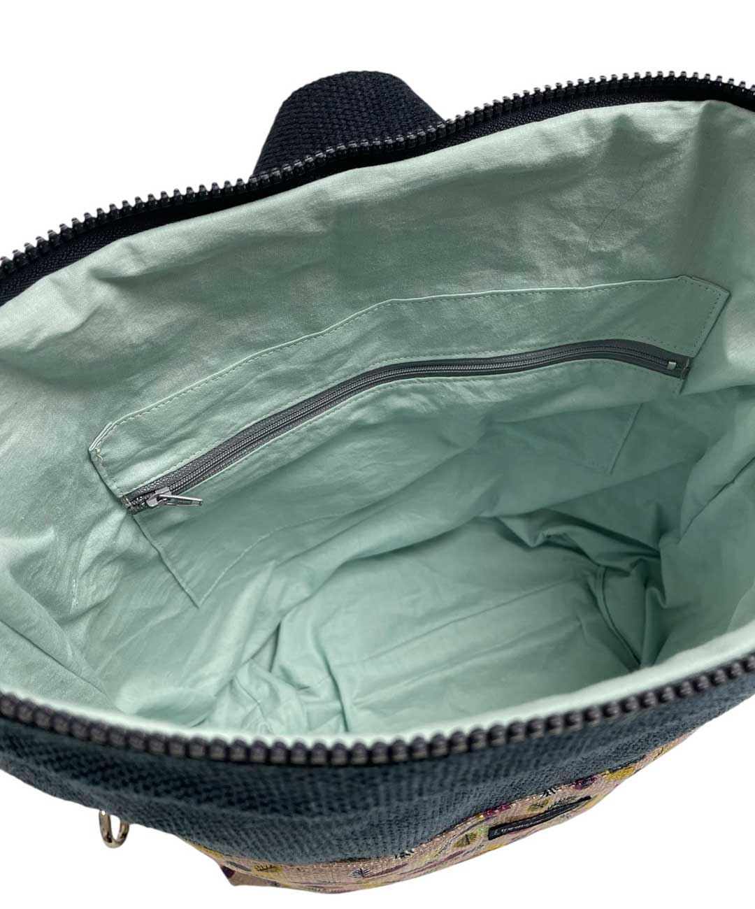 Zaino in tessuto da tappezzeria molto resistente e capiente con cerniera, tasca interna e bretelle regolabili.