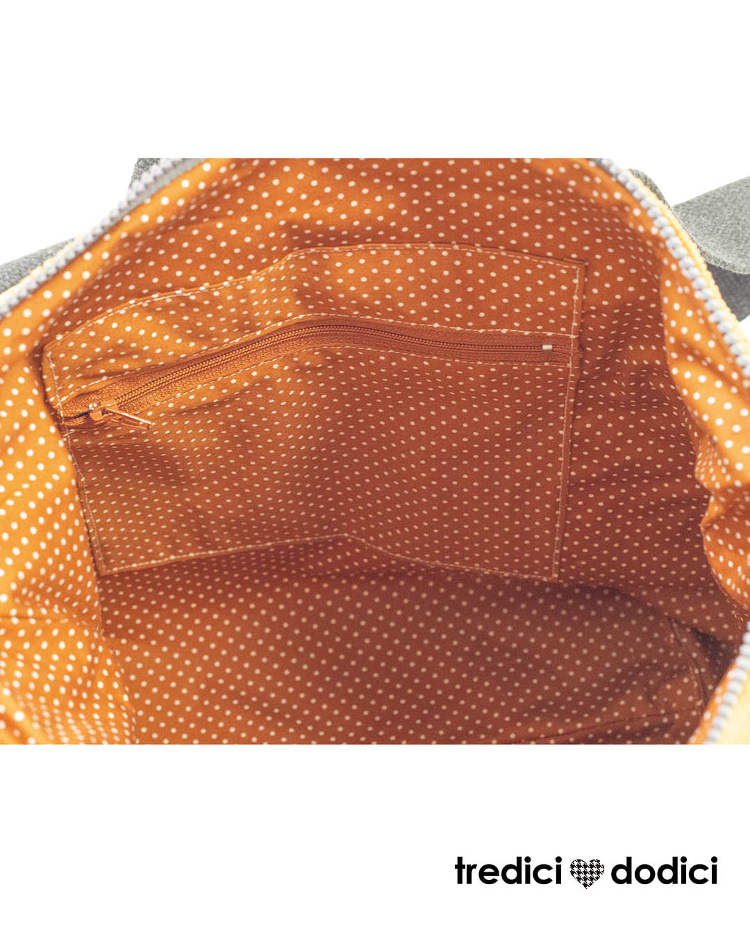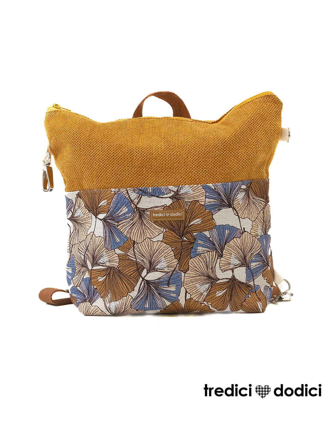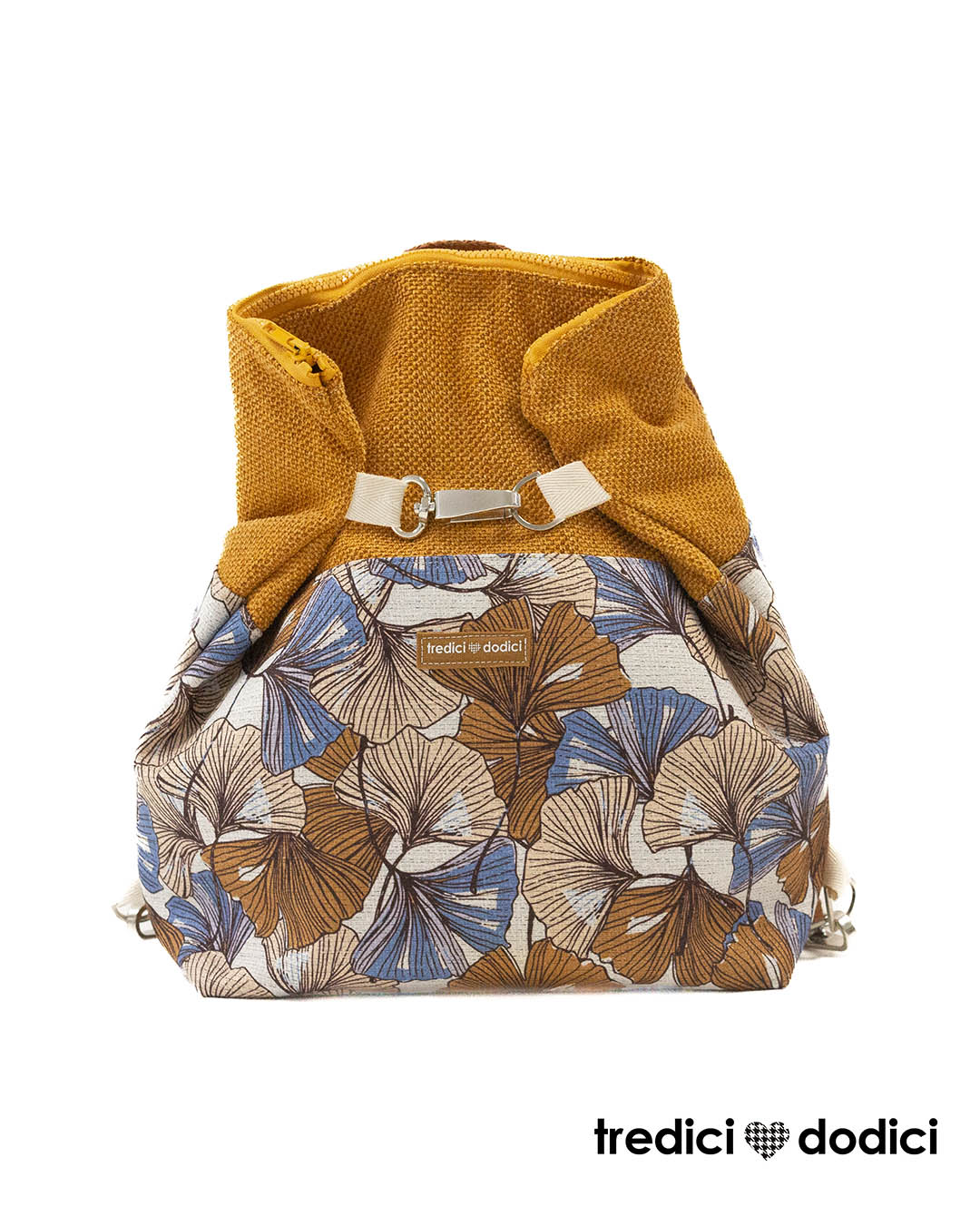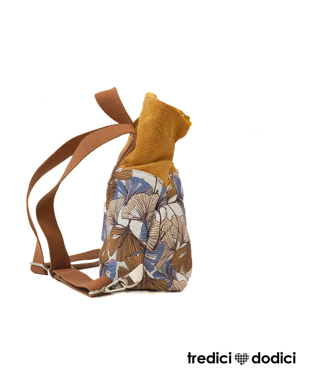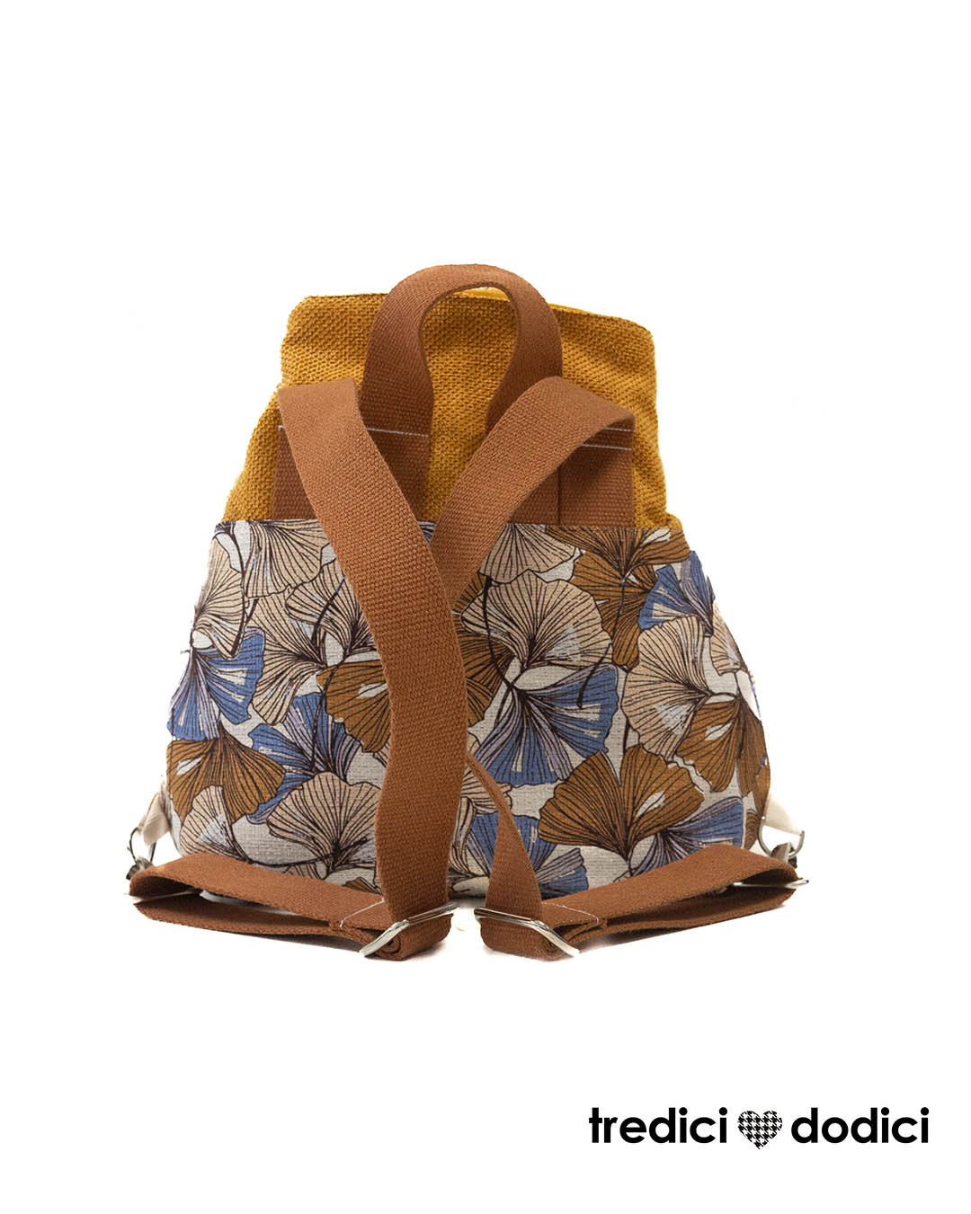 Zaino in tessuto da tappezzeria molto resistente e capiente con cerniera, tasca interna e bretelle regolabili.