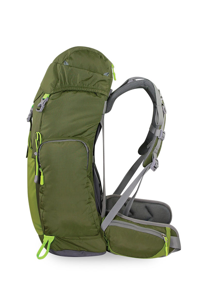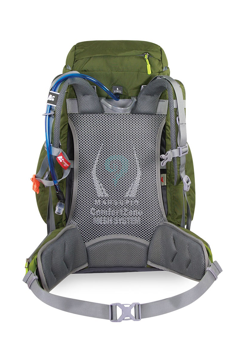 La tasca frontale è elasticizzata e i due tasconi laterali a soffietto sono molto capienti. Ha porta bastoni/piccozza ed è compatibile con i sistemi d’idratazione. Copri-zaino inserito sul fondo